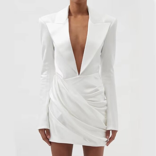 3 Pcs Deep V Neck Fashionable Pleated Asymmetric Hem Back Zipper Closure Blazer Dress