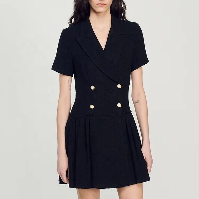 2 Pcs Spring Black Suit Collar Short Sleeve Women Short Tweed Blazer Dress