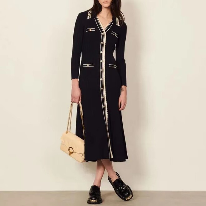 Spring Luxury Button V Neck Long Shirts Knit Dress