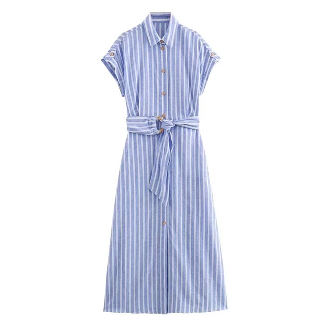 4 Pcs Striped Midi Sleeveless Shirt Dress With Belt