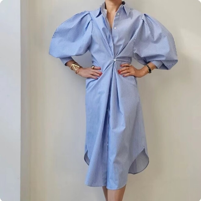 5 Pcs Irregular Lantern Sleeves Striped Womens Shirt Dress